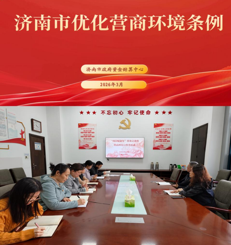 一是强化内部学习。及时下发通知,明确学习内容和要求,组织各处室通过集中学习、个人自学、专题研讨等形式,深入学习习近平总书记关于优化营商环境的重要论述、《济南市优化营商环境条例》等相关法律法规及政策措施,切实强化干部职工法治思维与服务意识,推动法治素养与业务能力双提升,确保学习入脑入心、取得实效。二是打造宣传阵地。制作主题PPT,围绕条例核心内容在结算大厅电子显示屏滚动播放,以直观、便捷的形式强化政策传导,营造“尊法、学法、守法、用法”的浓厚氛围。三是拓宽线上渠道。充分发挥网站宣传作用,在中心内外网更新《济南市优化营商环境条例》,实现线上线下宣传全覆盖,进一步扩大政策宣传覆盖面,切实提升法律法规的知晓度。
