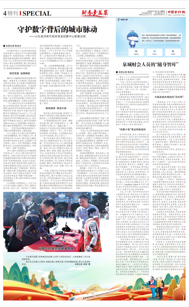 2026年2月27日,财政部《中国会计报》推出中心采访特刊,刊登《守护数字背后的城市脉动——山东省济南市政府资金结算中心新春见闻》《泉城财会人员的“随身智库”》两篇专题报道。