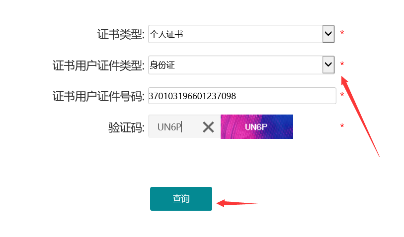 点击“证书状态查询”后进入查询页面,证书类型选“个人证书”,证书用户证件类型选“身份证”,填写身份证号码及验证码,点击“查询”,如下图所示: