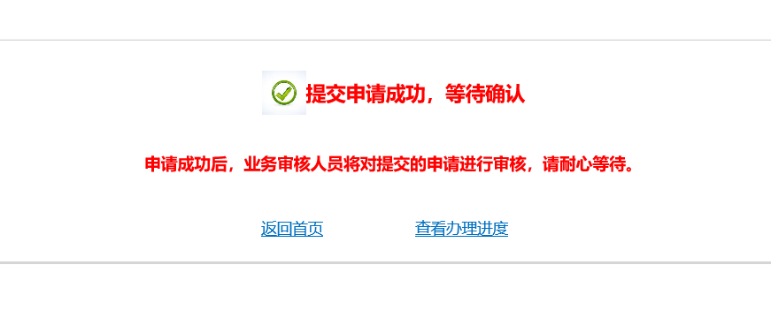 “确认提交”后,点击“查看办理进度”,或点击“返回首页”返回山东省数字证书认证服务平台自助页面http://221.214.5.66:59205/sdca/zizhu/index.php再点击“证书状态查询”板块,查询审核进度,待所属辖区的财政局管理员审核确认后方能下载新的证书,如下图所示: