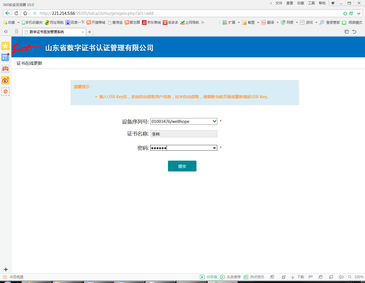 通过以上两种方式进入到证书在线更新页面后,证书名称框中自动显示用户姓名,如未显示,刷新当前网页或重新插拔证书即可;输入证书密码(2017年底前发的证书初始密码为12345678,2017年底后发的证书初始密码为111111,如已修改证书密码则输入修改后的密码;证书在线更新后,证书密码不变;如忘记证书密码请拨打4006078966),然后点击“提交”,如下图所示: