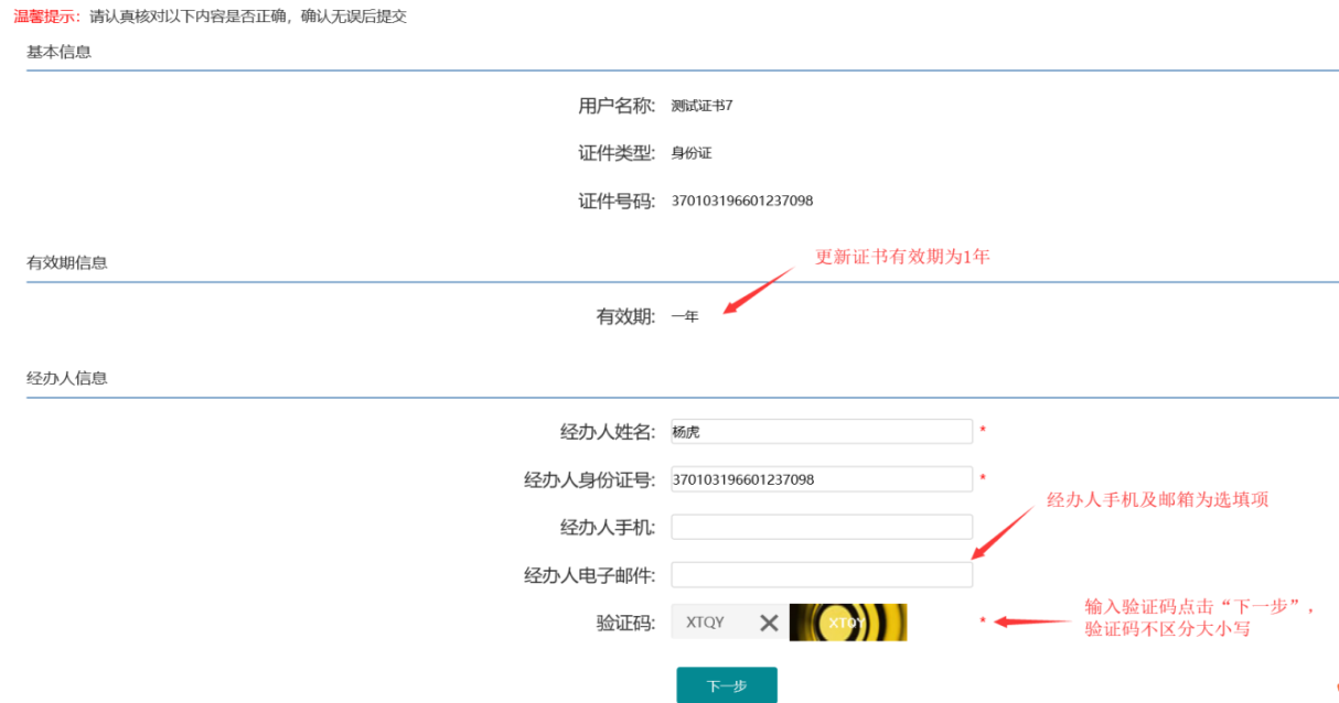 确认需要更新的证书信息,新证书的有效期在原证书基础上增加一年,填写经办人信息,输入验证码,点击“下一步”,如下图所示: