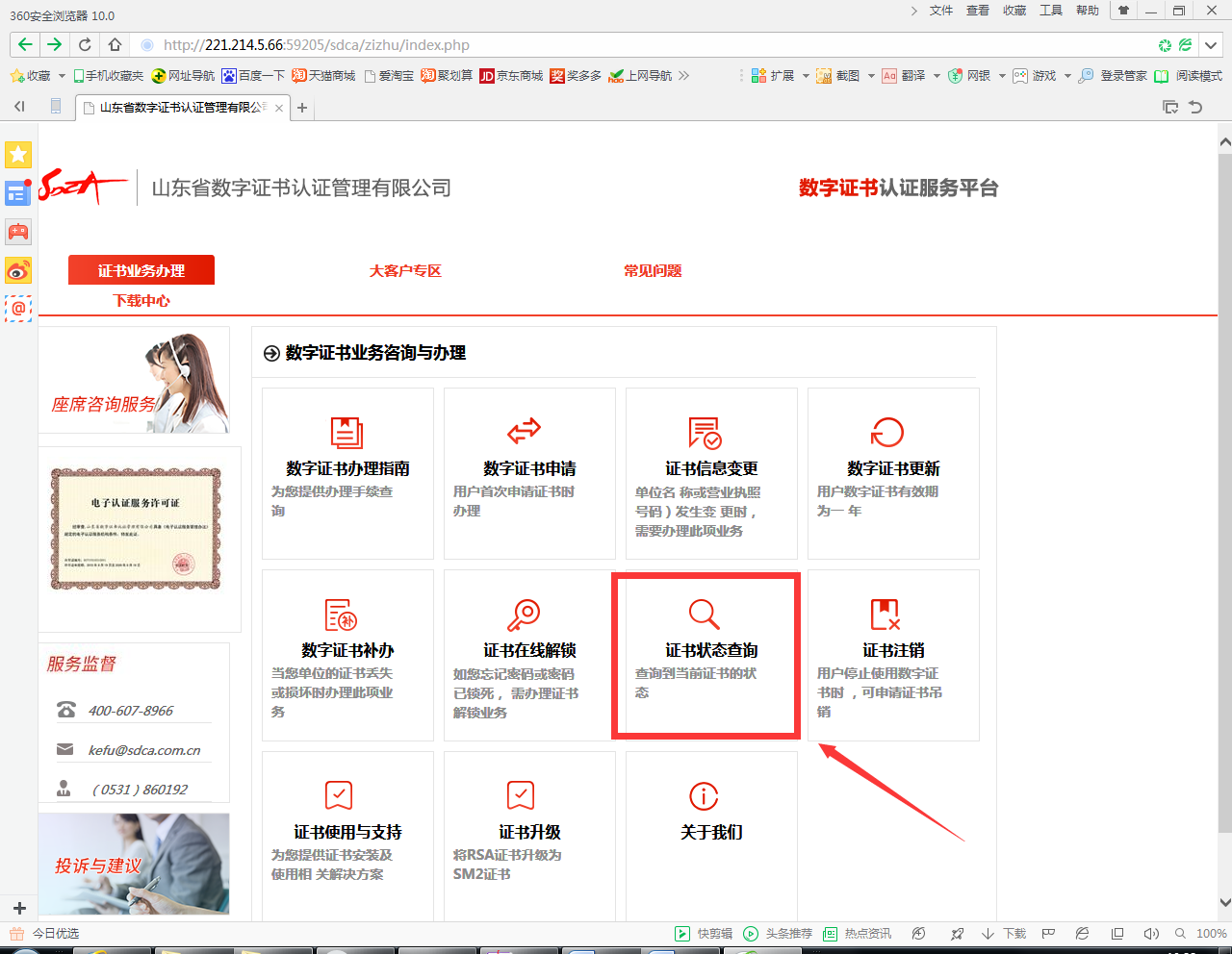 2、登录山东省数字证书认证服务平台自助页面: