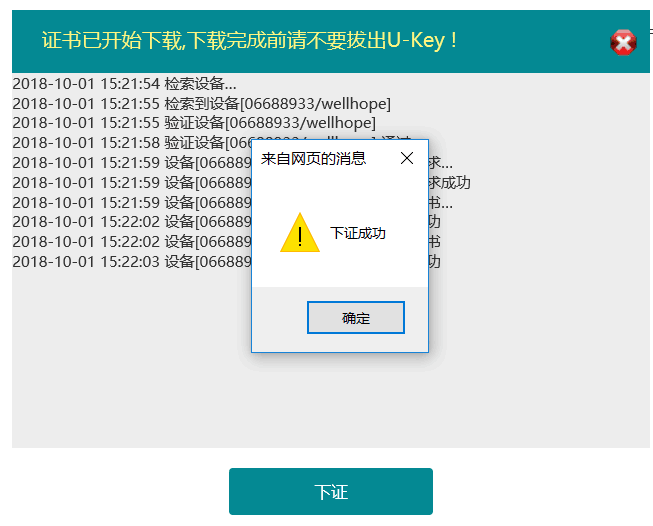 下载证书时请不要拔出USBKey,提示“下证成功”后再拔出,如下图所示: