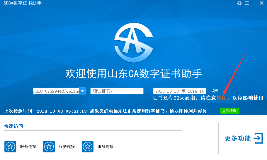 1、通过证书助手客户端首页到期提示,直接点击“续期”进行证书的更新操作,如下图所示: